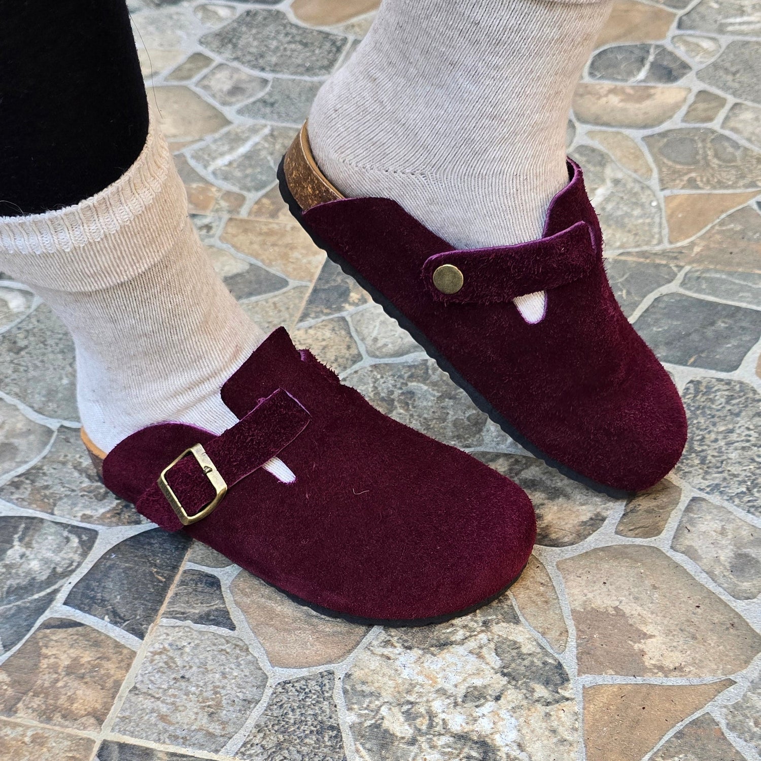 Une teinte bordeaux élégante, une boucle métallique raffinée et une semelle anatomique en liège pour un confort durable et un style intemporel.